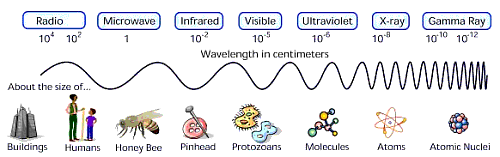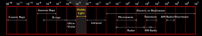The Electromagnetic Spectrum (EMS) involves many different elements or energies, each with their own specific identity based on their own specific wavelength/frequency. Please take a moment to examine the chart above (its not there for eye-candy). The chart defines each element of the EMS by its wavelength, frequency and energy. Note their differences.