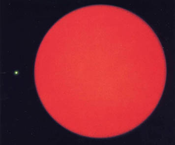 — the star to the left is our Sun today —From the outside, the star swells, brightens, and cools, becoming a RED GIANT, but inside, the star's interior is unable to withstand the compression force of its own gravity and the star collapses into a stellar remnant.